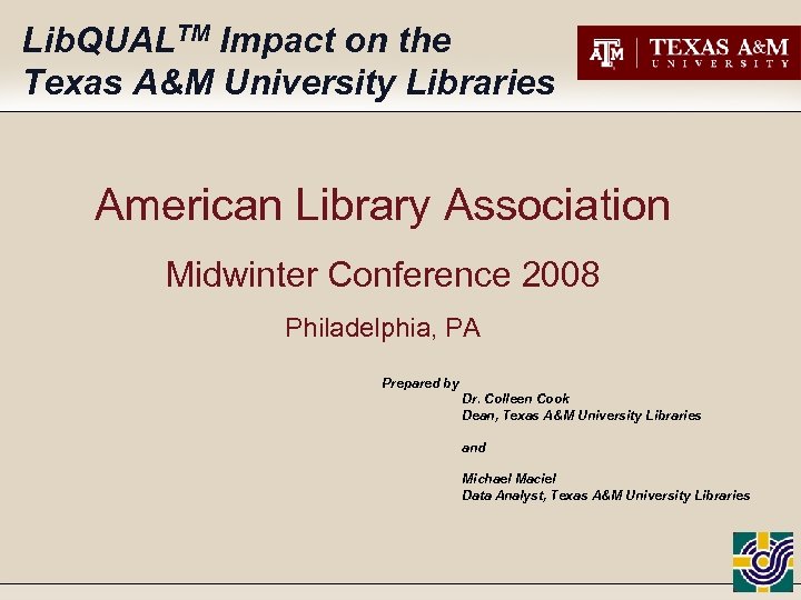 Lib. QUALTM Impact on the Texas A&M University Libraries American Library Association Midwinter Conference 2008 Philadelphia, PA Prepared by Dr. Colleen Cook Dean, Texas A&M University Libraries and Michael Maciel Data Analyst, Texas A&M University Libraries