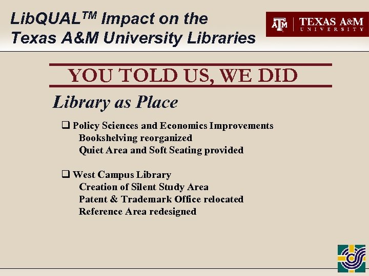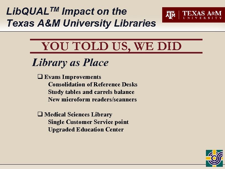 Lib. QUALTM Impact on the Texas A&M University Libraries YOU TOLD US, WE DID Library as Place q Evans Improvements Consolidation of Reference Desks Study tables and carrels balance New microform readers/scanners q Medical Sciences Library Single Customer Service point Upgraded Education Center