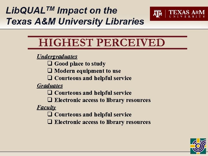 Lib. QUALTM Impact on the Texas A&M University Libraries HIGHEST PERCEIVED Undergraduates q Good place to study q Modern equipment to use q Courteous and helpful service Graduates q Courteous and helpful service q Electronic access to library resources Faculty q Courteous and helpful service q Electronic access to library resources