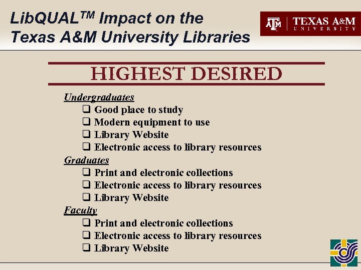 Lib. QUALTM Impact on the Texas A&M University Libraries HIGHEST DESIRED Undergraduates q Good place to study q Modern equipment to use q Library Website q Electronic access to library resources Graduates q Print and electronic collections q Electronic access to library resources q Library Website Faculty q Print and electronic collections q Electronic access to library resources q Library Website