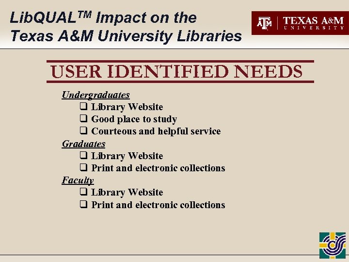 Lib. QUALTM Impact on the Texas A&M University Libraries USER IDENTIFIED NEEDS Undergraduates q Library Website q Good place to study q Courteous and helpful service Graduates q Library Website q Print and electronic collections Faculty q Library Website q Print and electronic collections