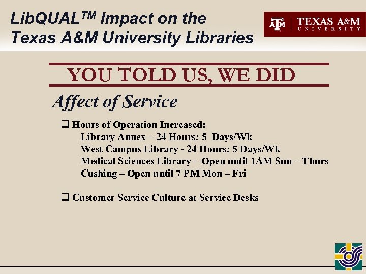 Lib. QUALTM Impact on the Texas A&M University Libraries YOU TOLD US, WE DID Affect of Service q Hours of Operation Increased: Library Annex – 24 Hours; 5 Days/Wk West Campus Library - 24 Hours; 5 Days/Wk Medical Sciences Library – Open until 1 AM Sun – Thurs Cushing – Open until 7 PM Mon – Fri q Customer Service Culture at Service Desks