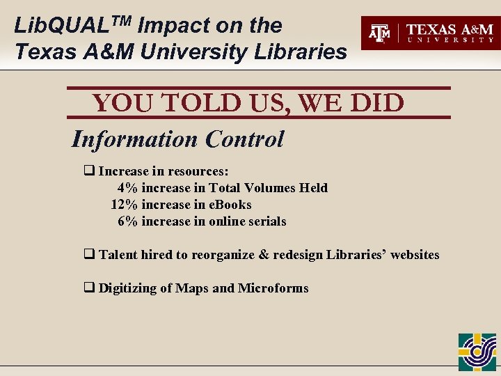 Lib. QUALTM Impact on the Texas A&M University Libraries YOU TOLD US, WE DID Information Control q Increase in resources: 4% increase in Total Volumes Held 12% increase in e. Books 6% increase in online serials q Talent hired to reorganize & redesign Libraries’ websites q Digitizing of Maps and Microforms