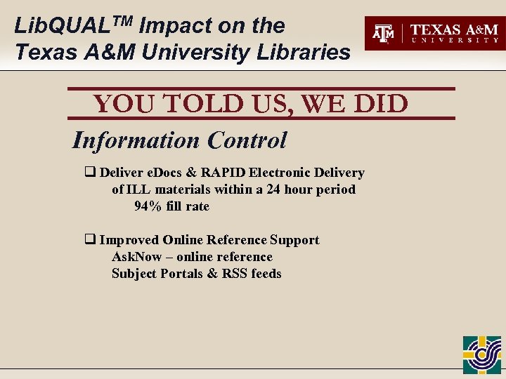 Lib. QUALTM Impact on the Texas A&M University Libraries YOU TOLD US, WE DID Information Control q Deliver e. Docs & RAPID Electronic Delivery of ILL materials within a 24 hour period 94% fill rate q Improved Online Reference Support Ask. Now – online reference Subject Portals & RSS feeds