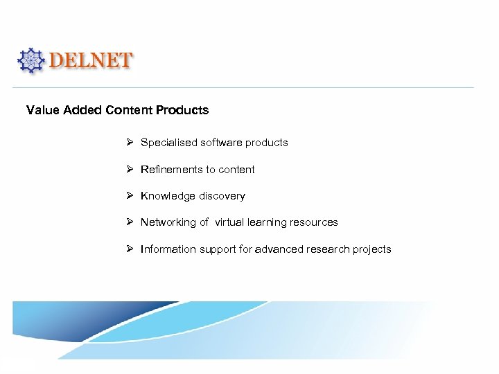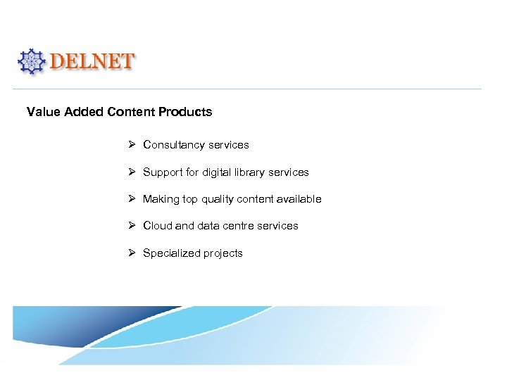 Value Added Content Products Ø Consultancy services Ø Support for digital library services Ø Making top quality content available Ø Cloud and data centre services Ø Specialized projects