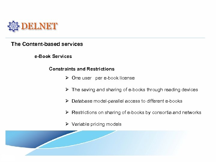 The Content-based services e-Book Services Constraints and Restrictions Ø One user per e-book license Ø The saving and sharing of e-books through reading devices Ø Database model-parallel access to different e-books Ø Restrictions on sharing of e-books by consortia and networks Ø Variable pricing models