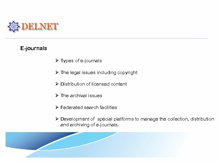 E-journals Ø Types of e-journals Ø The legal issues including copyright Ø Distribution of licensed content Ø The archival issues Ø Federated search facilities Ø Development of special platforms to manage the collection, distribution and archiving of e-journals.