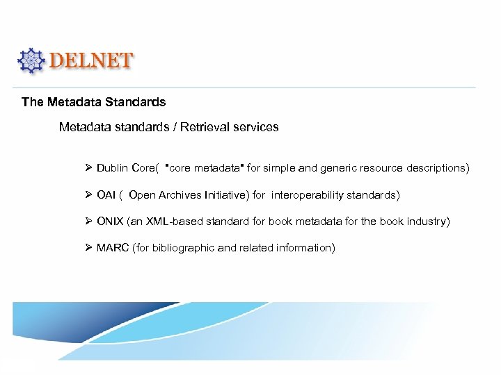 The Metadata Standards Metadata standards / Retrieval services Ø Dublin Core( "core metadata" for simple and generic resource descriptions) Ø OAI ( Open Archives Initiative) for interoperability standards) Ø ONIX (an XML-based standard for book metadata for the book industry) Ø MARC (for bibliographic and related information)
