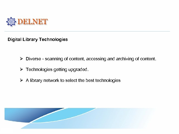 Digital Library Technologies Ø Diverse - scanning of content, accessing and archiving of content. Ø Technologies getting upgraded. Ø A library network to select the best technologies