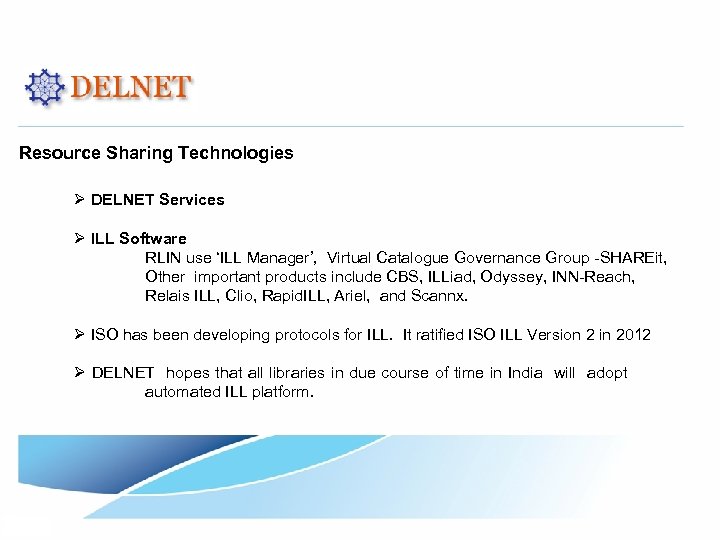 Resource Sharing Technologies Ø DELNET Services Ø ILL Software RLIN use ‘ILL Manager’, Virtual Catalogue Governance Group -SHAREit, Other important products include CBS, ILLiad, Odyssey, INN-Reach, Relais ILL, Clio, Rapid. ILL, Ariel, and Scannx. Ø ISO has been developing protocols for ILL. It ratified ISO ILL Version 2 in 2012 Ø DELNET hopes that all libraries in due course of time in India will adopt automated ILL platform.