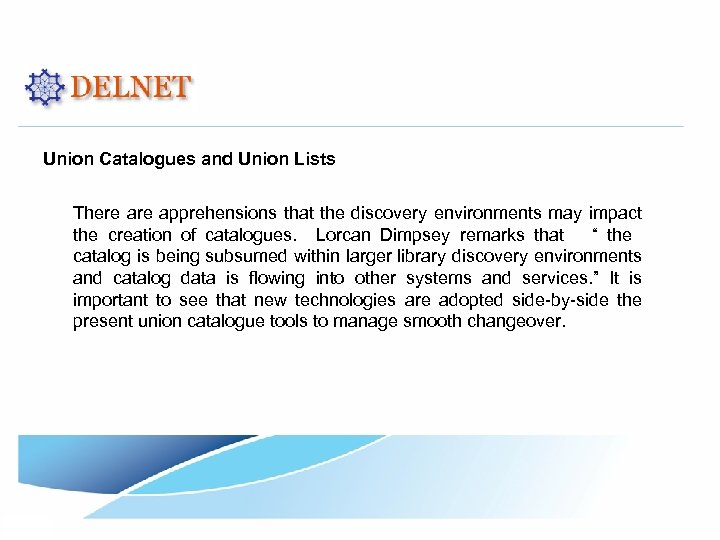 Union Catalogues and Union Lists There apprehensions that the discovery environments may impact the creation of catalogues. Lorcan Dimpsey remarks that “ the catalog is being subsumed within larger library discovery environments and catalog data is flowing into other systems and services. ” It is important to see that new technologies are adopted side-by-side the present union catalogue tools to manage smooth changeover.