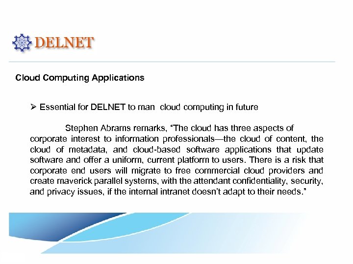 Cloud Computing Applications Ø Essential for DELNET to man cloud computing in future Stephen Abrams remarks, “The cloud has three aspects of corporate interest to information professionals—the cloud of content, the cloud of metadata, and cloud-based software applications that update software and offer a uniform, current platform to users. There is a risk that corporate end users will migrate to free commercial cloud providers and create maverick parallel systems, with the attendant confidentiality, security, and privacy issues, if the internal intranet doesn’t adapt to their needs. ”