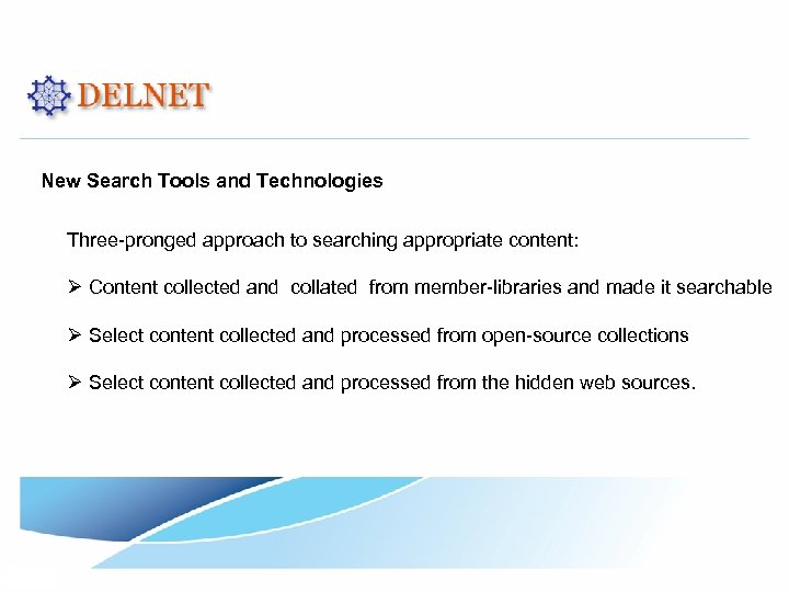 New Search Tools and Technologies Three-pronged approach to searching appropriate content: Ø Content collected and collated from member-libraries and made it searchable Ø Select content collected and processed from open-source collections Ø Select content collected and processed from the hidden web sources.