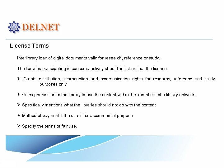License Terms Interlibrary loan of digital documents valid for research, reference or study. The libraries participating in consortia activity should insist on that the license: Ø Grants distribution, reproduction and communication rights for research, reference and study purposes only Ø Gives permission to the library to use the content within the members of a library network Ø Specifically mentions what the libraries should not do with the content Ø Method of payment if the use is for a commercial purpose Ø Specify the terms of fair use.