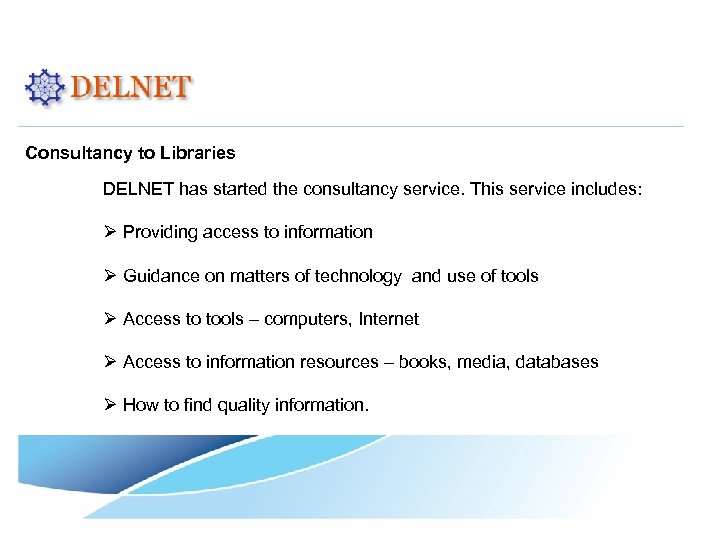 Consultancy to Libraries DELNET has started the consultancy service. This service includes: Ø Providing access to information Ø Guidance on matters of technology and use of tools Ø Access to tools – computers, Internet Ø Access to information resources – books, media, databases Ø How to find quality information.