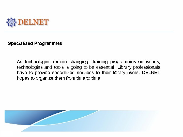 Specialised Programmes As technologies remain changing training programmes on issues, technologies and tools is going to be essential. Library professionals have to provide specialized services to their library users. DELNET hopes to organize them from time to time.