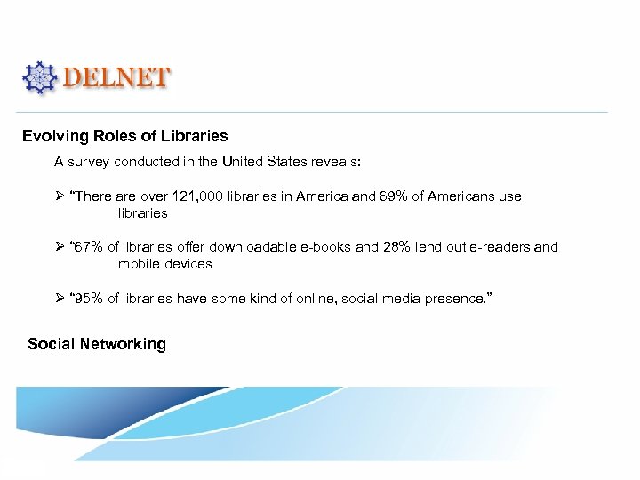 Evolving Roles of Libraries A survey conducted in the United States reveals: Ø “There are over 121, 000 libraries in America and 69% of Americans use libraries Ø “ 67% of libraries offer downloadable e-books and 28% lend out e-readers and mobile devices Ø “ 95% of libraries have some kind of online, social media presence. ” Social Networking