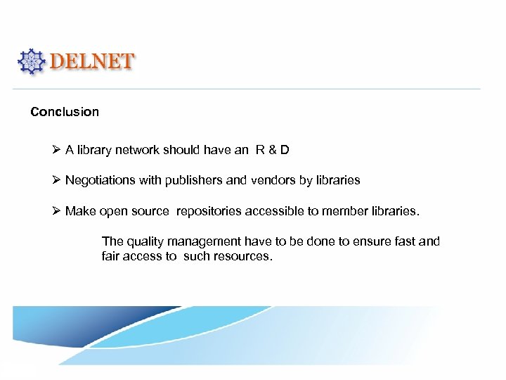 Conclusion Ø A library network should have an R & D Ø Negotiations with publishers and vendors by libraries Ø Make open source repositories accessible to member libraries. The quality management have to be done to ensure fast and fair access to such resources.