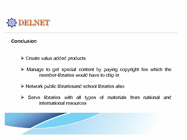 Conclusion Ø Create value added products Ø Manage to get special content by paying copyright fee which the member-libraries would have to chip in Ø Network public librariesand school libraries also Ø Serve libraries with all types of materials from national and international resources