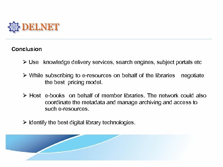 Conclusion Ø Use knowledge delivery services, search engines, subject portals etc Ø While subscribing to e-resources on behalf of the libraries negotiate the best pricing model. Ø Host e-books on behalf of member libraries. The network could also coordinate the metadata and manage archiving and access to such e-resources. Ø Identify the best digital library technologies.