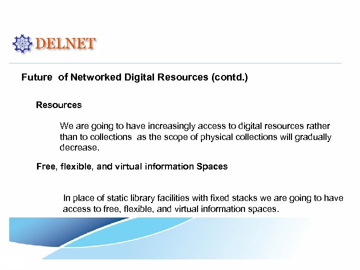 Future of Networked Digital Resources (contd. ) Resources We are going to have increasingly access to digital resources rather than to collections as the scope of physical collections will gradually decrease. Free, flexible, and virtual information Spaces In place of static library facilities with fixed stacks we are going to have access to free, flexible, and virtual information spaces.