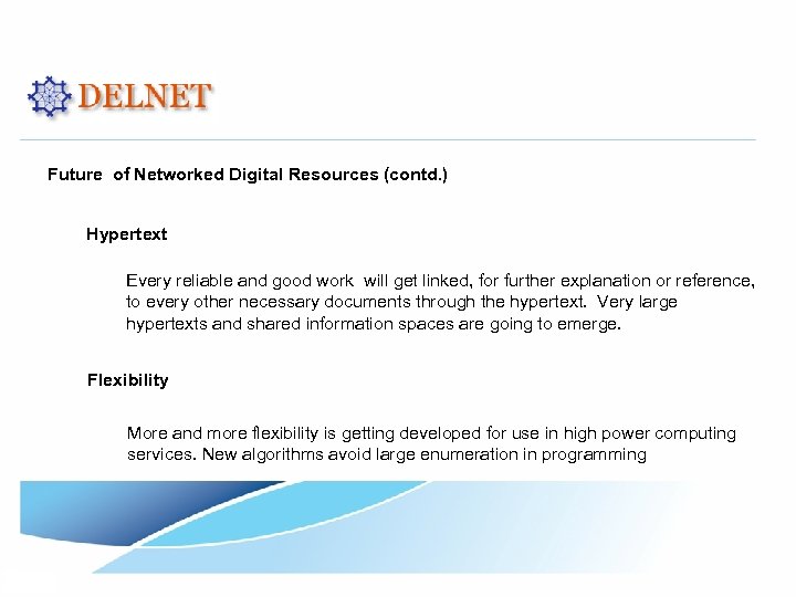 Future of Networked Digital Resources (contd. ) Hypertext Every reliable and good work will get linked, for further explanation or reference, to every other necessary documents through the hypertext. Very large hypertexts and shared information spaces are going to emerge. Flexibility More and more flexibility is getting developed for use in high power computing services. New algorithms avoid large enumeration in programming