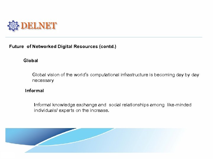 Future of Networked Digital Resources (contd. ) Global vision of the world’s computational infrastructure is becoming day by day necessary Informal knowledge exchange and social relationships among like-minded individuals/ experts on the increase.