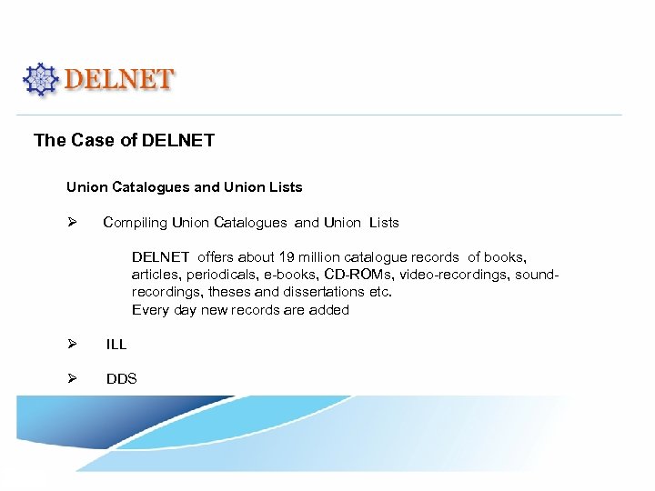 The Case of DELNET Union Catalogues and Union Lists Ø Compiling Union Catalogues and Union Lists DELNET offers about 19 million catalogue records of books, articles, periodicals, e-books, CD-ROMs, video-recordings, soundrecordings, theses and dissertations etc. Every day new records are added Ø ILL Ø DDS