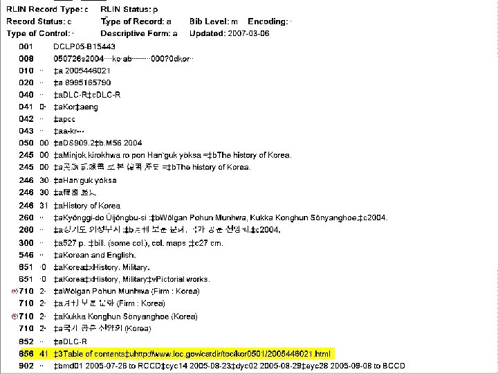 The Spacing in CJK Script Fields (with attention to Korean) • OCLC’s No Spacing Policy for all CJK records • RLG’s Announcement to strip out the spaces between CJK characters, beginning in March 2007 – LC has been studying the implications of the plan – LC tested 3 types of searches: Keyword, left-anchored, and heading – LC believes the impact for Chinese and Japanese is minimal, but removal of spaces has significant implications for searching Korean