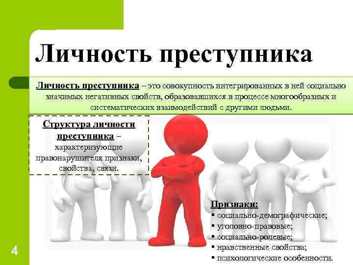 Личность преступника – это совокупность интегрированных в ней социально значимых негативных свойств, образовавшихся в процессе многообразных и систематических взаимодействий с другими людьми. Структура личности преступника – характеризующие правонарушителя признаки, свойства, связи. Признаки: 4 § социально-демографические; § уголовно-правовые; § социально-ролевые; § нравственные свойства; § психологические особенности.
