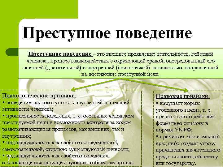 Преступное поведение – это внешнее проявление деятельности, действий человека, процесс взаимодействия с окружающей средой, опосредованный его внешней (двигательной) и внутренней (психической) активностью, направленной на достижение преступной цели. Психологические признаки: § поведение как совокупность внутренней и внешней активности человека; § произвольность поведения, т. е. осознание человеком преследуемой цели и возможности контроля за ходом разворачивающихся процессов, как внешних, так и внутренних; § индивидуальность как свойство определенной, самостоятельной, отдельно существующей личности; § индивидуальность как свойство поведения, 7 отклоняющегося от существующих в обществе правил. Правовые признаки: § нарушает нормы уголовного закона, т. е. признаки этого действия формально описаны в нормах УК РФ; § причиняет значительный вред либо создает угрозу причинения значительного вреда личности, обществу или государству.
