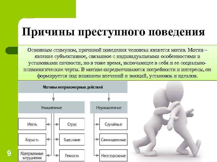 Причины преступного поведения Основным стимулом, причиной поведения человека является мотив. Мотив – явление субъективное, связанное с индивидуальными особенностями и установками личности, но в тоже время, включающее в себя и ее социальнопсихологические черты. В мотиве опредмечиваются потребности и интересы, он формируется под влиянием влечений и эмоций, установок и идеалов. 9