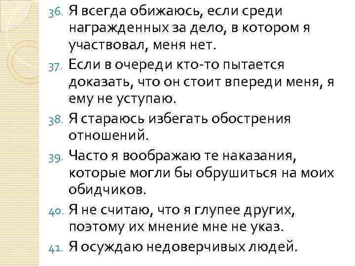 Я всегда обижаюсь, если среди награжденных за дело, в котором я участвовал, меня нет. 37. Если в очереди кто-то пытается доказать, что он стоит впереди меня, я ему не уступаю. 38. Я стараюсь избегать обострения отношений. 39. Часто я воображаю те наказания, которые могли бы обрушиться на моих обидчиков. 40. Я не считаю, что я глупее других, поэтому их мнение мне не указ. 41. Я осуждаю недоверчивых людей. 36.