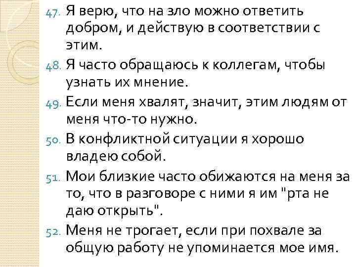 Я верю, что на зло можно ответить добром, и действую в соответствии с этим. 48. Я часто обращаюсь к коллегам, чтобы узнать их мнение. 49. Если меня хвалят, значит, этим людям от меня что-то нужно. 50. В конфликтной ситуации я хорошо владею собой. 51. Мои близкие часто обижаются на меня за то, что в разговоре с ними я им "рта не даю открыть". 52. Меня не трогает, если при похвале за общую работу не упоминается мое имя. 47.