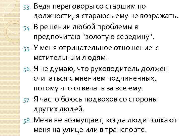 Ведя переговоры со старшим по должности, я стараюсь ему не возражать. 54. В решении любой проблемы я предпочитаю "золотую середину". 55. У меня отрицательное отношение к мстительным людям. 56. Я не думаю, что руководитель должен считаться с мнением подчиненных, потому что отвечать за все ему. 57. Я часто боюсь подвохов со стороны других людей. 58. Меня не возмущает, когда люди толкают меня на улице или в транспорте. 53.