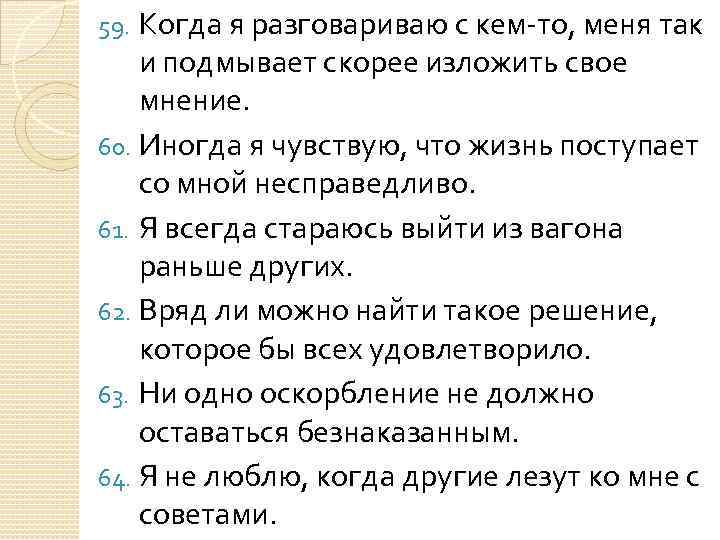 59. Когда я разговариваю с кем-то, меня так и подмывает скорее изложить свое мнение. 60. Иногда я чувствую, что жизнь поступает со мной несправедливо. 61. Я всегда стараюсь выйти из вагона раньше других. 62. Вряд ли можно найти такое решение, которое бы всех удовлетворило. 63. Ни одно оскорбление не должно оставаться безнаказанным. 64. Я не люблю, когда другие лезут ко мне с советами.