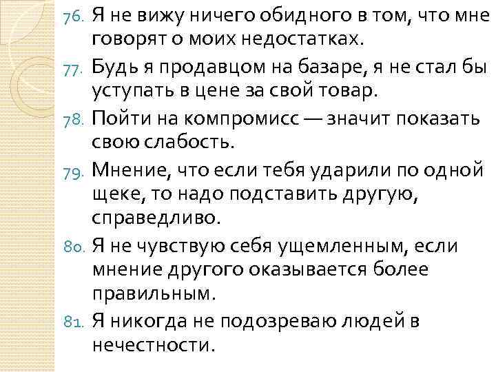 Я не вижу ничего обидного в том, что мне говорят о моих недостатках. 77. Будь я продавцом на базаре, я не стал бы уступать в цене за свой товар. 78. Пойти на компромисс — значит показать свою слабость. 79. Мнение, что если тебя ударили по одной щеке, то надо подставить другую, справедливо. 80. Я не чувствую себя ущемленным, если мнение другого оказывается более правильным. 81. Я никогда не подозреваю людей в нечестности. 76.
