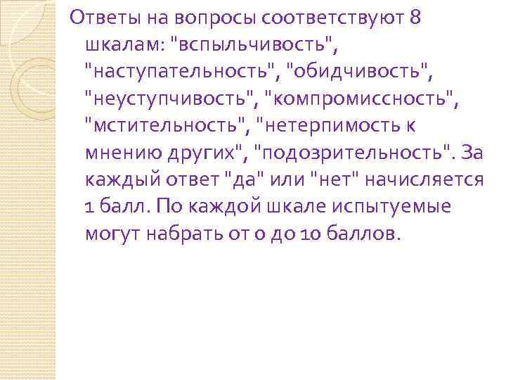 Ответы на вопросы соответствуют 8 шкалам: "вспыльчивость", "наступательность", "обидчивость", "неуступчивость", "компромиссность", "мстительность", "нетерпимость к мнению других", "подозрительность". За каждый ответ "да" или "нет" начисляется 1 балл. По каждой шкале испытуемые могут набрать от 0 до 10 баллов.