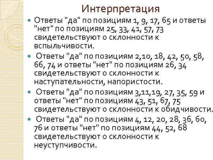 Интерпретация Ответы "да" по позициям 1, 9, 17, 65 и ответы "нет" по позициям 25, 33, 41, 57, 73 свидетельствуют о склонности к вспыльчивости. Ответы "да" по позициям 2, 10, 18, 42, 50, 58, 66, 74 и ответы "нет" по позициям 26, 34 свидетельствуют о склонности к наступательности, напористости. Ответы "да" по позициям 3, 11, 19, 27, 35, 59 и ответы "нет" по позициям 43, 51, 67, 75 свидетельствуют о склонности к обидчивости. Ответы "да" по позициям 4, 12, 20, 28, 36, 60, 76 и ответы "нет" по позициям 44, 52, 68 свидетельствуют о склонности к неуступчивости.