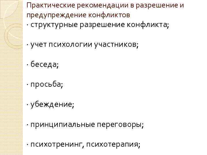 Практические рекомендации в разрешение и предупреждение конфликтов · структурные разрешение конфликта; · учет психологии участников; · беседа; · просьба; · убеждение; · принципиальные переговоры; · психотренинг, психотерапия;