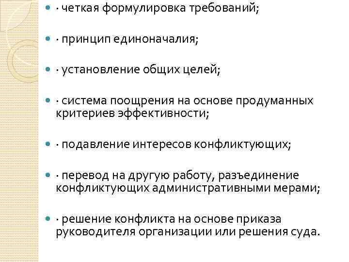 · четкая формулировка требований; · принцип единоначалия; · установление общих целей; · система поощрения на основе продуманных критериев эффективности; · подавление интересов конфликтующих; · перевод на другую работу, разъединение конфликтующих административными мерами; · решение конфликта на основе приказа руководителя организации или решения суда.