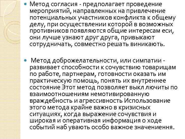 Метод согласия - предполагает проведение мероприятий, направленных на привлечение потенциальных участников конфликта к общему делу, при осуществлении которой в возможных противников появляются общие интересам еси, они лучше узнают друга, привыкают сотрудничать, совместно решать виникають. Метод доброжелательности, или симпатии развивает способности к сочувствию товарищам по работе, партнерам, готовности оказать им практическую помощь, понять их внутреннее состояние Этот метод позволяет выкл лючиты по взаимоотношениям немотивированную враждебность и агрессивность Использование этого метода крайне важно в кризисных ситуациях, когда выражение сочувствия и широкая и оперативная информация о ходе событий наб увають особо важное значениення.
