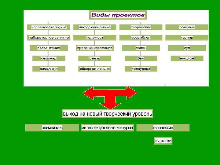 Творческие проекты n не имеют детально проработанной структуры, подчиняются жанру конечного результата (газета, фильм, праздник), но результаты оформляются в продуманной завершенной форме (сценарий фильма или праздника, макет газеты).