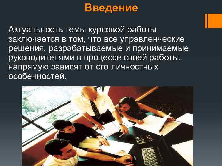 Введение Актуальность темы курсовой работы заключается в том, что все управленческие решения, разрабатываемые и принимаемые руководителями в процессе своей работы, напрямую зависят от его личностных особенностей.