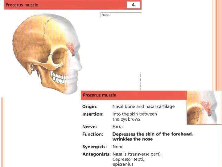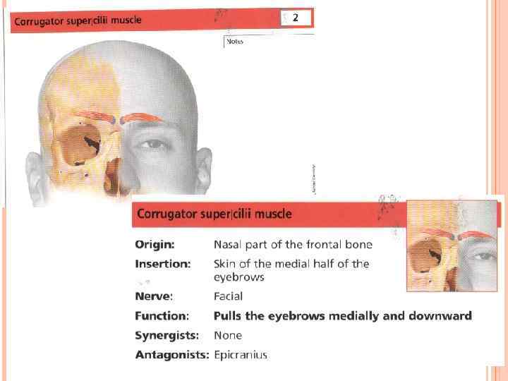 Эта маленькая мышца расположена между двумя лобными мышцами у основания брови (внутренний край). Она нахмуривает брови, сближая их и образуя между ними вертикальные морщины. Это мышца сильной эмоциональной активности. Она делает заметными возбуждение и боль. 3 Мышца, сморщивающая бровь