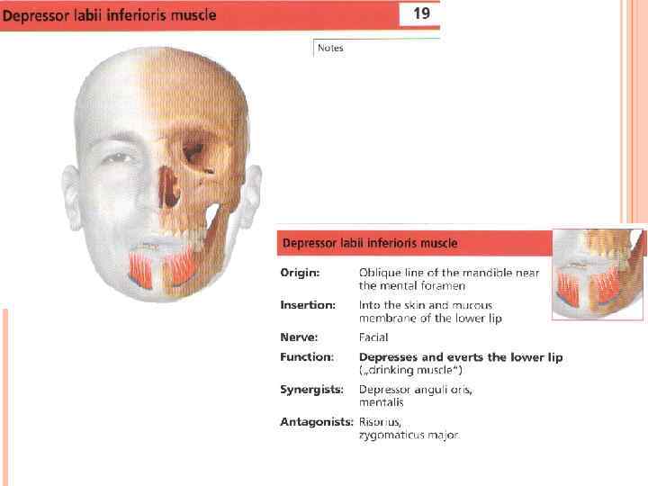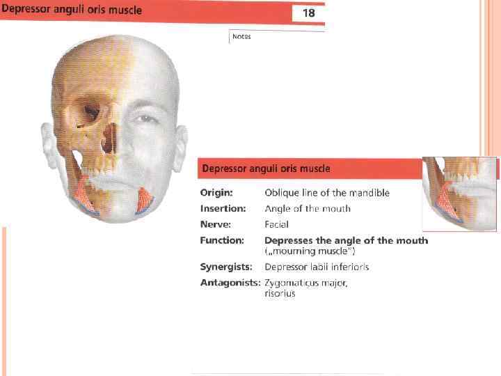 Она располагается вблизи квадратной мышцы подбородка и почти полностью ее покрывает. Прикрепляется к кости на уровне нижней челюсти, а к коже – в уголках губ. Сокращение треугольной мышцы приводит к следующим изменениям в чертах лица: уголки губ опускаются, линия губ искривляется, носоподбородочные складки опускаются вниз и резко обозначаются. Отсюда следует, что лицо приобретает выражение более или менее глубокой печали. Если же происходит значительное сокращение треугольной мышцы, появляется выражение презрения или отвращения. 14 Мышца, опускающая угол рта