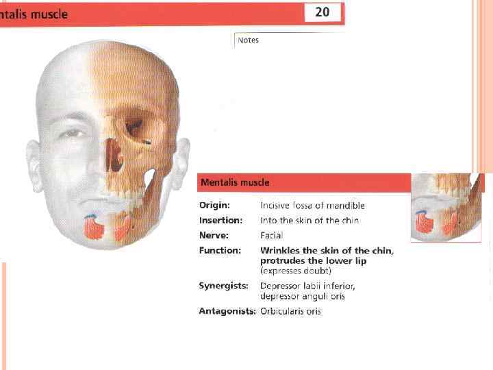 Эта маленькая мышца располагается в глубоком слое подбородка. Когда она сокращается, она приподнимает нижнюю губу и подбородок покрывается складками и бугорками. Эту мышцу легко обнаружить у нерешительных людей, которые пребывают в сомнении и имеют выражение лица, соответствующее «бормотанию сквозь зубы» . 15 Подбородочная мышца