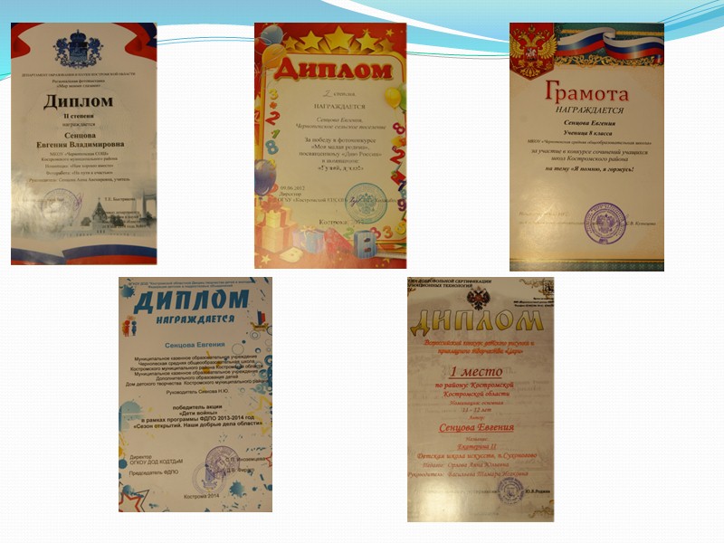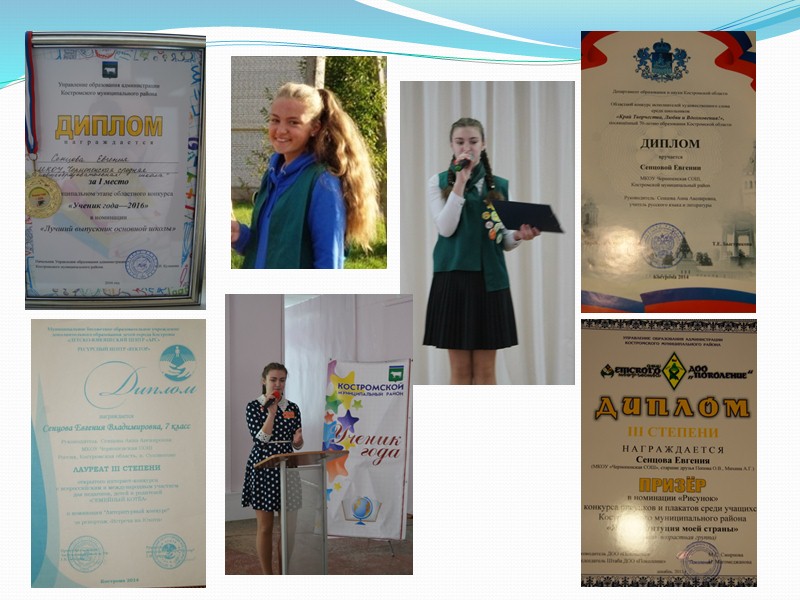 Евгения- командир дружины «Океан», мастер ДОО «Поколение». Учится на отлично, занимается хореографией, изобразительным искусством, пением, волейболом, баскетболом. Ответственна, артистична, дружелюбна, готова всегда придти на помощь. Получает стипендию главы администрации Костромского района. Уполномоченный по правам ребенка при губернаторе Костромской области. Награждена почетной медалью «Молодой патриот». Неоднократно побеждала в районном конкурсе чтецов, а в областном занимала призовые места.