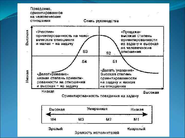 Теория «жизненного цикла» Третий стиль S 3 - характеризуется умеренно высокой степенью зрелости (МЗ). В этой ситуации подчиненные могут, но не хотят отвечать за выполнение задания. Четвертый стиль S 4 - характеризуется высокой степенью зре лости (М 4). В этой ситуации подчиненные и могут, и хотят нести ответственность