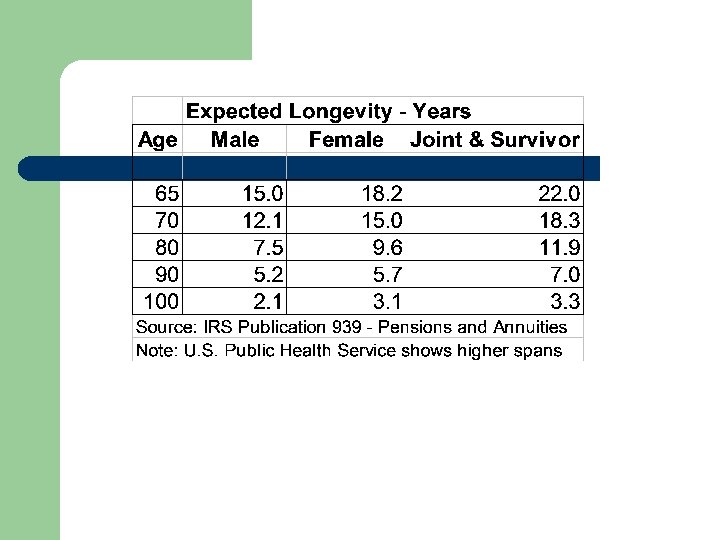 2003 Retirement Confidence Survey Three in ten have not saved for retirement · One-third not confident about enough money for retirement · Fewer that 40% have calculated how much money they will need to save by the time they retire · Life expectancies at age 65: o Women, 19. 2 years, on average o Men, 16. 3 years, on average ·